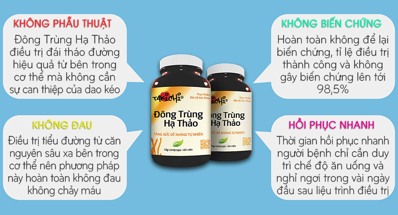 Việc điều trị bệnh tiểu đường với sự hỗ trợ của Đông Trùng Hạ Thảo TAKICHI, cùng với chế độ ăn uống hợp lý và rèn luyện thể lực đúng mực sẽ rất có ích cho việc điều trị bệnh tiểu đường đồng thời giảm thiểu các biến chứng do bệnh tiểu đường gây ra.